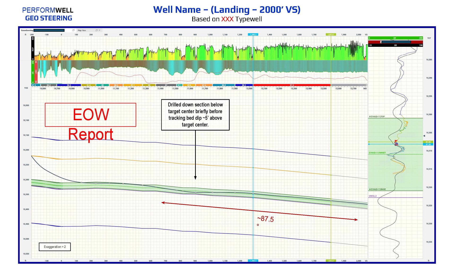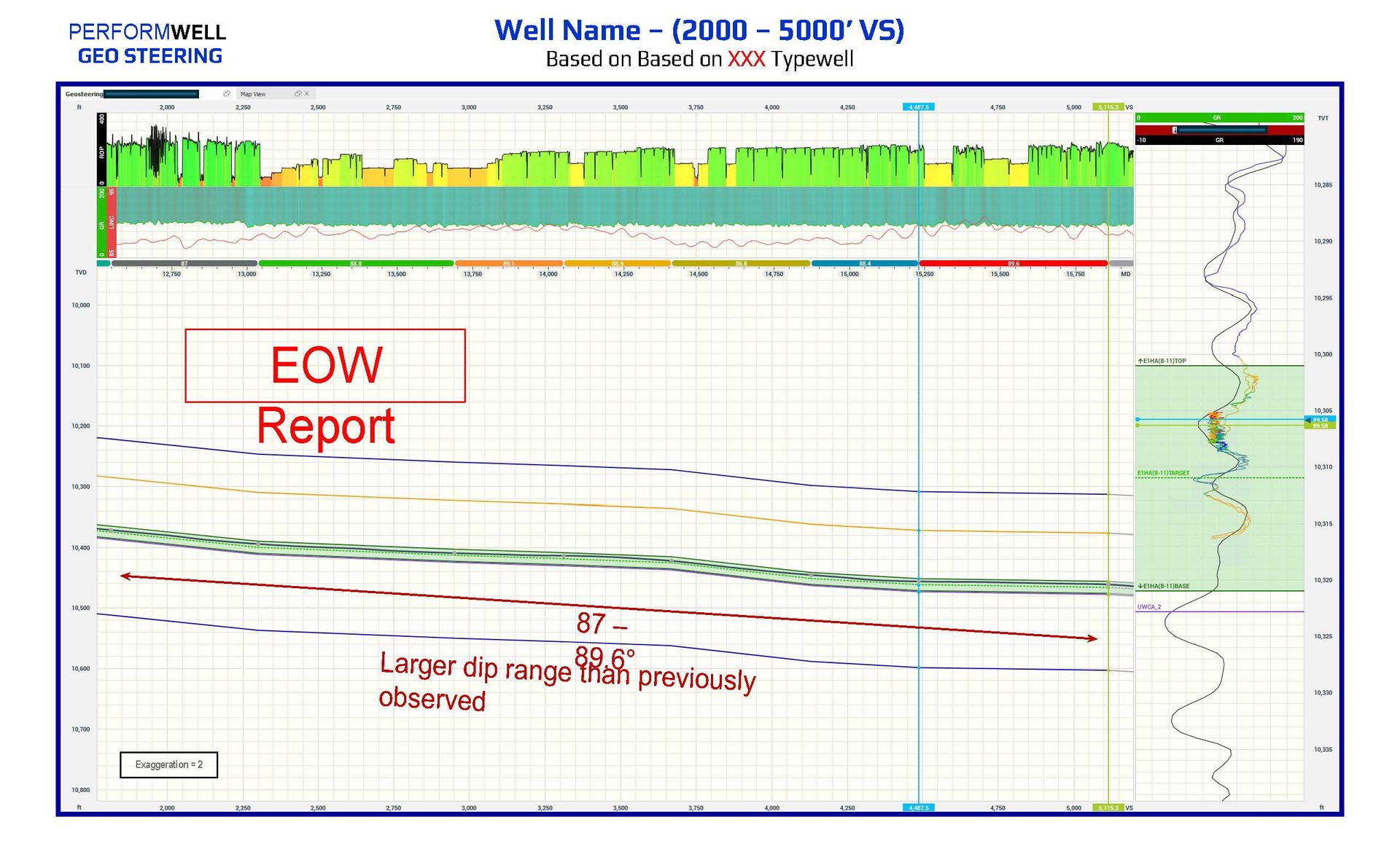 - Remote Geosteering on a 12 or 24hr basis on a daily usually from 100’ above KOP to well TD
